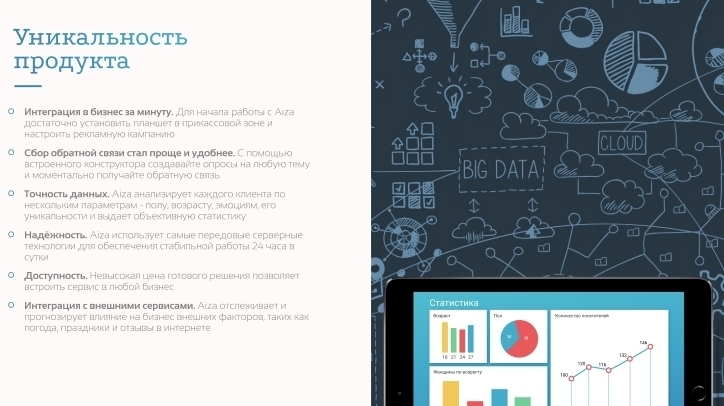 AIZA легко интегрируется в любой бизнес и выглядет органично не смущая клиентов!